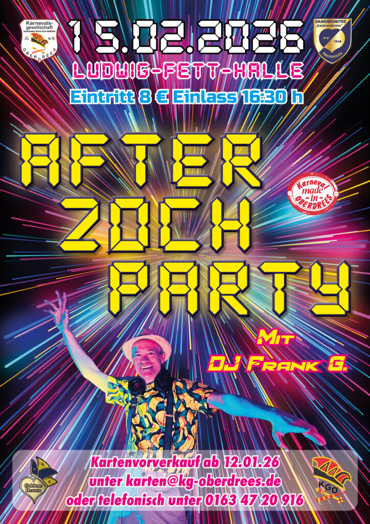 Die Karnevalsgemeinschaft lädt herzlich zur AfterZoch-Party am 15. Februar 2026 ab 16:30 in der Ludwig-Fett-Halle ein.