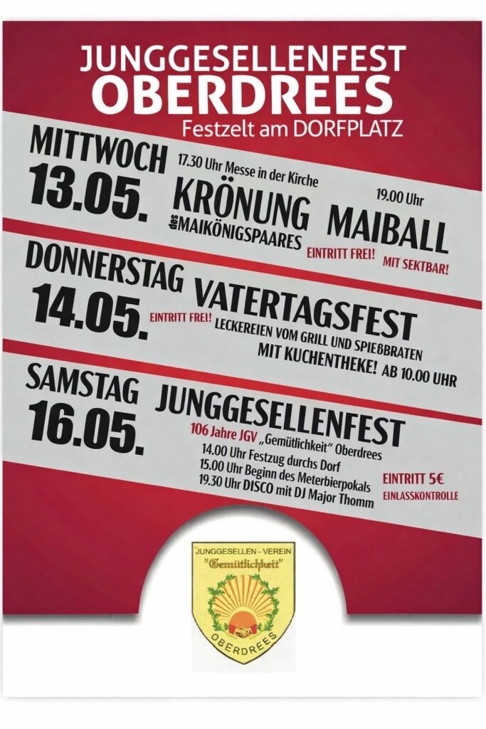 Am 13.05, 14.05. und 26.05 laden die Oberdreeser Junggesellen herzlich dazu ein, den diesjährigen Krönungsball, das Vatertagsfest und das Junggesellenfest zu besuchen.