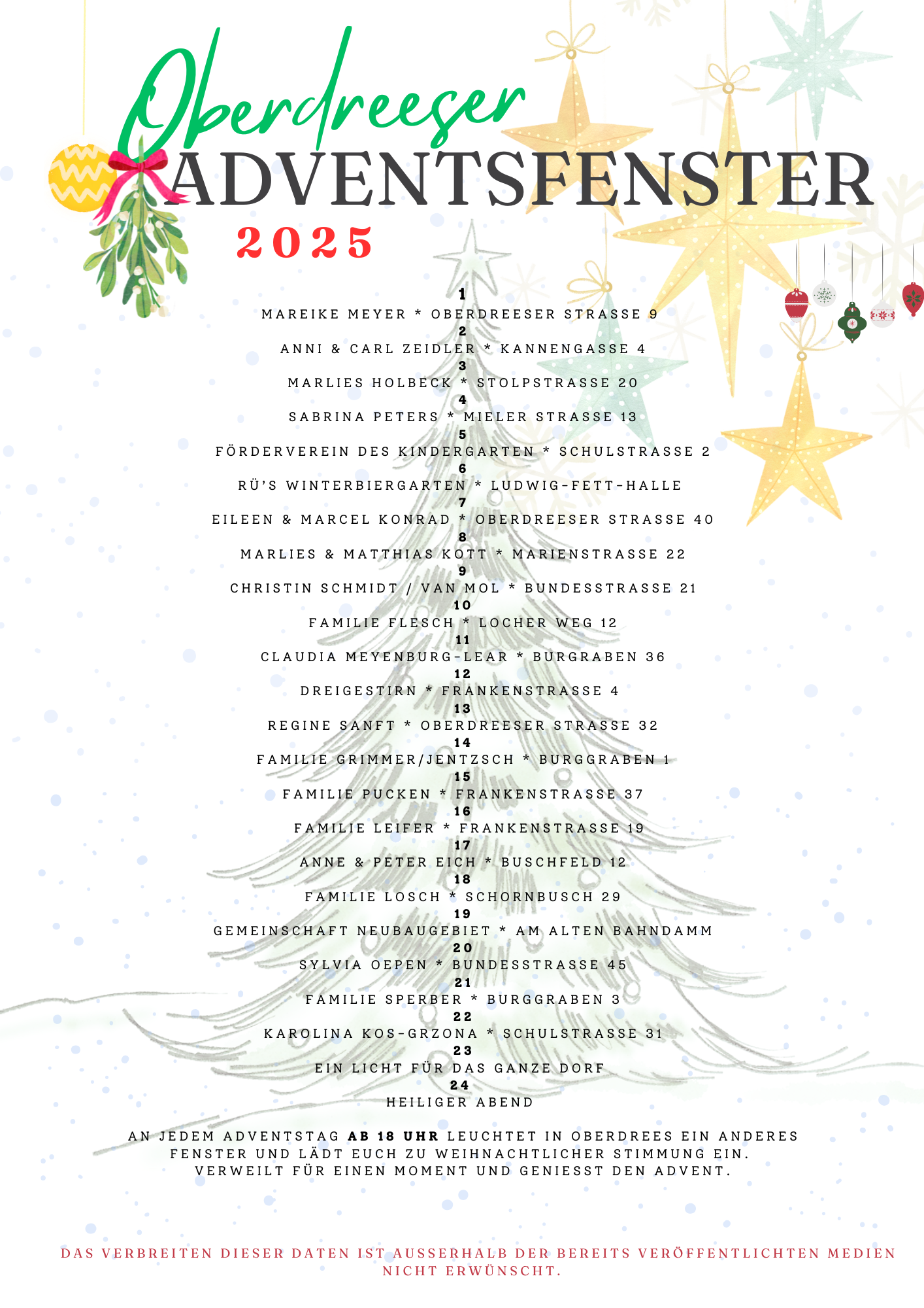 Das sind die Teilnehmer des diesjährigen „Oberdreeser Adventsfensters“. Wir wünschen allen Teilnehmern und Gästen eine gemütliche Adventszeit.