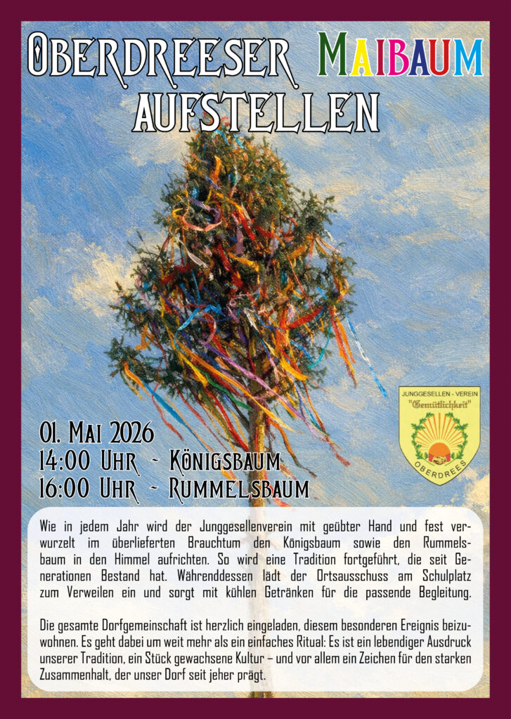 Liebe Oberdreeserinnen und Oberdreeser, anbei die herzliche Einladung zum diesjährigen „Oberdreeser Maibaum Aufstellen“. Der Junggesellenverein Gemütlichkeit sowie der Ortsausschuss würden sich über eine rege Teilnahme der Oberdreeser freuen.