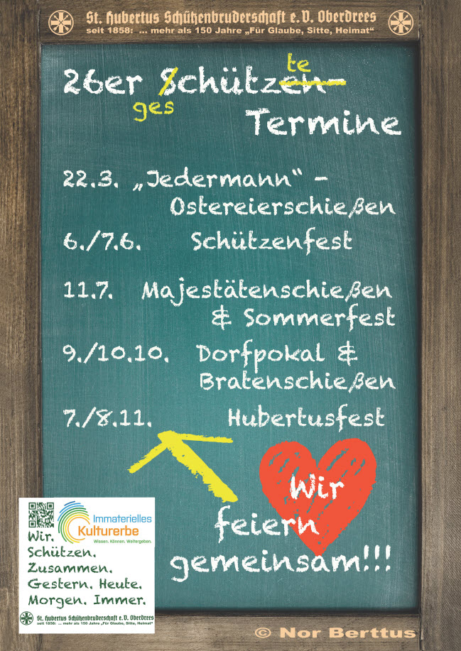 Der Schützenverein St. Hubertus Schützenbruderschaft e.V. Oberdrees gibt die Termine für 2026 bekannt.